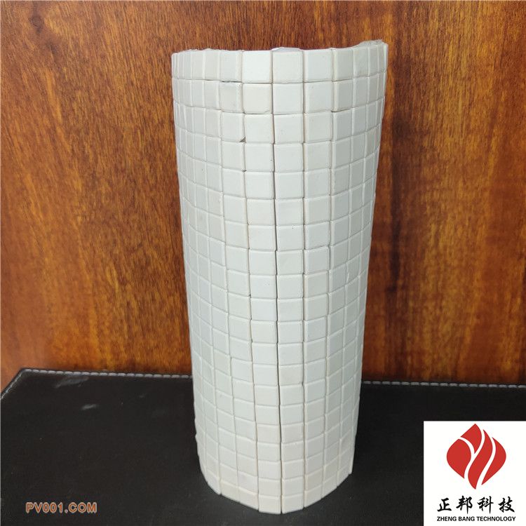 4、粘贴:将刮好胶的陶瓷片按顺序贴在施工部位,用橡皮锤轻轻敲实,特别注意每块陶瓷片都能均匀粘贴在钢板上。陶瓷片装贴需紧密贴紧筒壁,陶瓷装贴应平整并应尽可能形成光滑面,每相邻的陶瓷块的高低差应小于0.1mm。