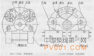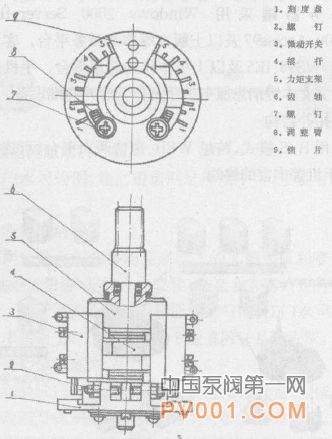 电动闸阀在不同的地方使用因闸板两端的水压差或气压差不同(闸阀关闭时),转矩限制机构可适当调整。在电动闸阀闸板两端方向水压或气压差低的地方使用时,转矩限制机构应调到较低力矩,在使用HZ系列(见图1)、Z系列(见图2)或ZB系列(见图3)阀门电动装置时,只要调整转矩限制机构的调节拔板与触动板之间的距离来实现(详见调整说明)。刻度牌上标有刻度,其刻度值越大,转矩值也越大。电动阀门闸板关闭时两端的水压差或气压差越大时,所调整的转矩值就要求越大,反之就小。以上几个系列调整方式一样。在调整ZD系列阀门电动装置时(见图4),要卸下箱体侧盖,调整转矩限制机构,旋松调节螺母中的紧定螺钉,旋松调节螺母,放松钮矩弹簧,并且放到最松的位置,然后把调节螺母中的紧定螺钉旋紧,固定住调节螺母。注意紧定螺钉的顶端必须落在轴槽内,如顶端不正好对准轴槽,只要把调节螺母向压缩弹簧的方向少许转动,使其对准轴槽紧定螺钉。然后把侧盖装上,调整开启阀门。如转矩限制机构运动作,则弹簧太松调紧到不动作为止。这样可以使转矩限制机构在较低的转矩下工作,保证电动闸阀因行程控制机构失灵时,或其他原因超力矩时,转矩限制机构可靠动作,并切断电机电源,保护阀门不致损坏。在一些地方使用的电动闸阀也不必调整的关闭太紧,调整到手动关紧后再松回半圈(或一圈)位置为好,(或不漏水或气时为好)。