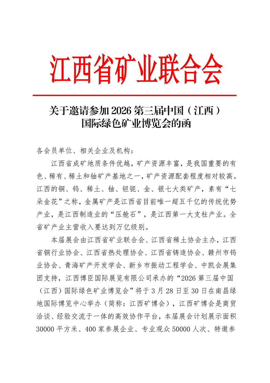 本届展会由江西省矿业联合会、江西省稀土协会主办,江西省铜行业协会、江西省热处理协会、江西省铸造协会、赣州市钨业协会、青海矿产开发学会、新乡市振动工程学会、中凯会展集团支持,江西博臣国际展览有限公司承办的“2026第三届中国(江西)国际绿色矿业博览会”将于3月28日至30日在南昌绿地国际博览中心举办(简称:江西矿博会),江西矿博会是商贸洽谈、经验交流于一体的高效协作平台,本届展会计划展示面积30000平方米、400家参展企业、专业观众50000人次、特邀参观团数量200+家。重点参观团包括:中国五矿、中国黄金集团、中国有色矿业、江铜集团、江西三和金业、西部矿业、金石宝矿业、绿洲矿业、金川集团、中国铝业、三一重工、徐工集团等。展会还邀请媒体100+家全程跟踪报道。