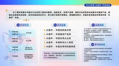 奖项设置全面:涵盖年度创新技术奖、年度最佳产品奖、年度优秀企业奖、年度影响力人物奖、年度优秀项目案例奖五大奖项,从技术、产品、企业、人物到项目,全维度覆盖污水处理领域的创新成果。无论是能显著降低污泥含水率的脱水技术,还是实现智能化运营的处理系统,只要经实践检验能为行业降本增效,均可参与,接受由院士、资深工程师及企业技术负责人组成的权威评审团的专业评定。