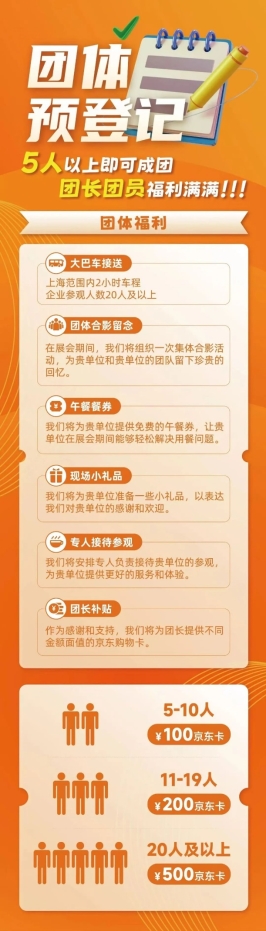 我们为组团参观准备了大巴车接送、午餐、团长京东福利卡、现场礼品、留念合影等, 5人以上即可成团,人数越多、福利越多!