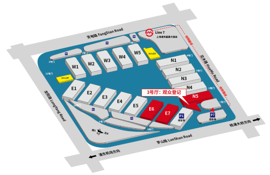 网约车/出租车:请定位“上海新国际博览中心3号入口大厅”下车(位于花木路与罗山路交叉口,或导航:上海新国际博览中心7号门)。