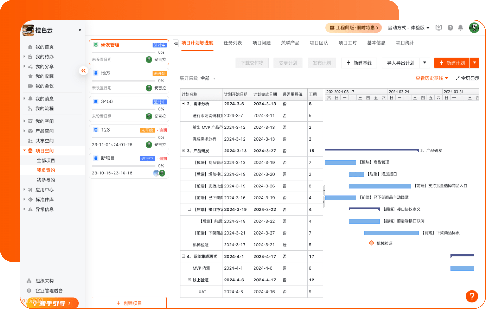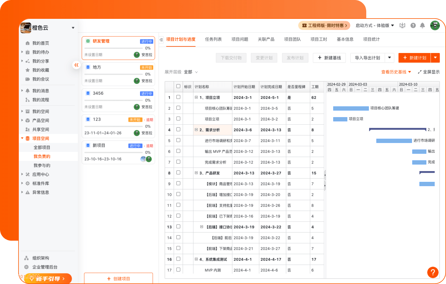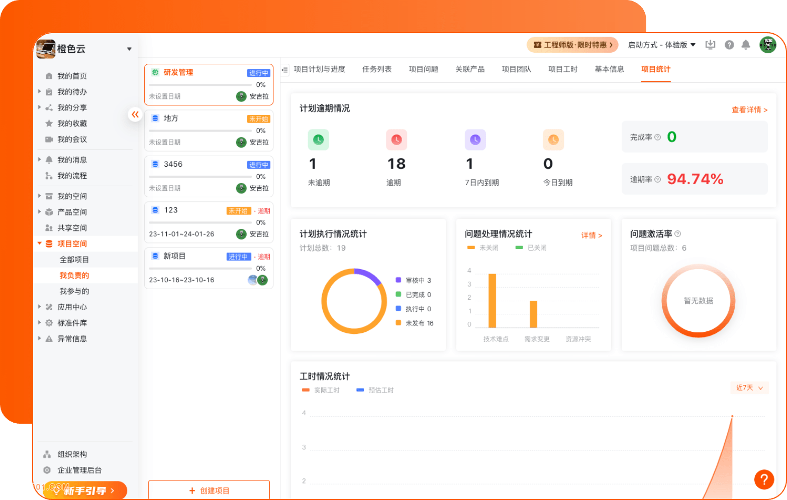 提供不同维度的项目数据统计,便于进行总结和分析,同时也可以快速进入相应工作区,进行工作开展。