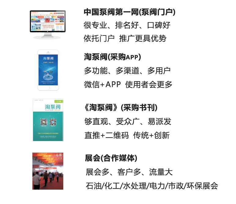 淘泵阀主要通过:中国泵阀第一网(电脑端门户,排名前三)+ 淘泵阀手机端(APP、微信公众号)+ 淘泵阀书籍 + 展会(20以上泵阀、化工、石油、环保、水处理展会)等方式推广。