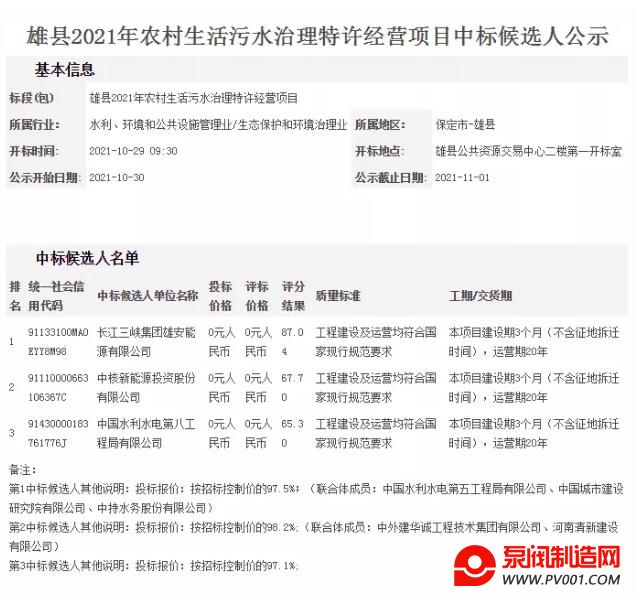 10月30日,全国公共资源交易平台发布了雄县2021年农村生活污水治理特许经营项目中标候选人公示,项目第一中标候选人为长江三峡集团雄安能源有限公司联合中国水利水电第五工程局有限公司、中国城市建设研究院有限公司、中持水务股份有限公司联合体。