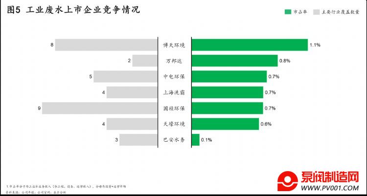 不同行业废水的处理方式大不相同,且存在较高的技术壁垒,工业废水治理企业通常只能专注于某一个或某几个细分领域,导致当前行业竞争格局分散,头部企业市场占有率偏低,“小而散”是主流状态(如图5)。