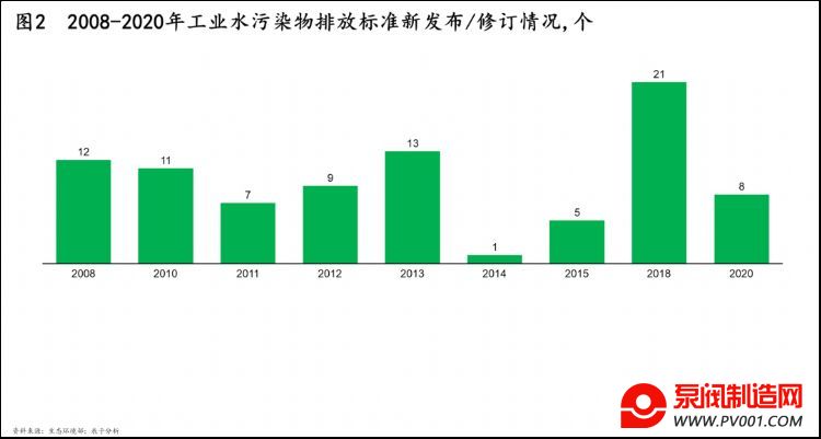 二是排放标准趋严,自行处理难度加大。中央环保督察已完成全覆盖,最新的第二轮、第三批下沉工作任务也已基本完成,8个中央生态环境保护督察组于2021年4月6日至4月9日陆续进驻8个省(区)开展督察。此外,我国自2008年起持续发布及修订了包括造纸、化工等行业在内的水污染物排放标准,不断收紧水污染物排放的限值(如图2)。过去,部分企业内部的废水处理设施处于非正常运行状态,开工率低、处理质量低,不利于达标排放,第三方运营的重要性日渐凸显。