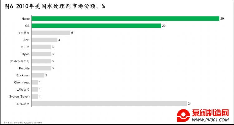 对标国外成熟市场,行业集中度将随着市场发展提升,有多元化技术储备的企业竞争优势更大。例如,美国工业废水市场进入成熟期后,诞生了Nalco和GE水处理两大龙头(如图6),在水处理剂的市场份额合计达到49%,多元化的产品线则是他们的核心竞争力之一。