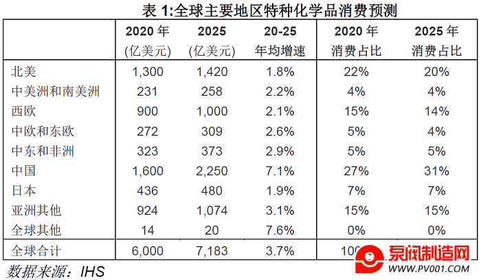 未来5年,全球特种化学品的市场规模增长总体保持在3.6%的年均增速,预计到2025年全球特种化学品的市场规模接近7200亿美元。其中,中国、北美、西欧和日本的消费占比分别为31%、20%、14%和7%,消费规模分别为2250亿美元、1420亿美元、1000亿美元和480亿美元。