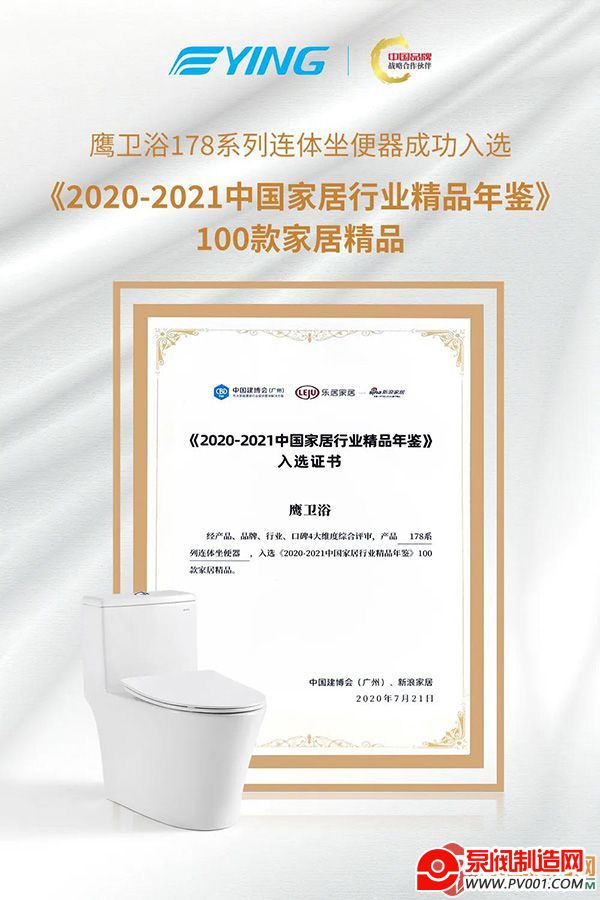 7月21日,由中国对外贸易中心(集团)主办的中国建博会(广州)携手新浪家居重磅推出《2020-2021中国家居行业精品年鉴》发布会在广州保利世贸博览馆举行,会上对15大热门品类,100款家居好产品入选名单进行公示并授牌认证。鹰卫浴凭借着“头部企业”、“优秀的产品研发、设计及生产能力”实力加持,在众多品牌产品评选中脱颖而出,鹰卫浴178系列连体坐便器产品成功入册年鉴精品目录。