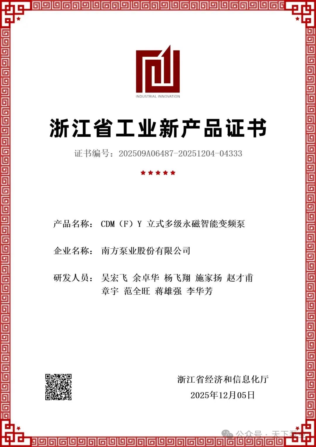 近日,受浙江省经济和信息化厅委托,余杭区经信局组织专家团队对南方泵业CDM(F)Y立式多级永磁智能变频泵等4项新产品进行验收评价,全部通过省级工业新产品鉴定验收。