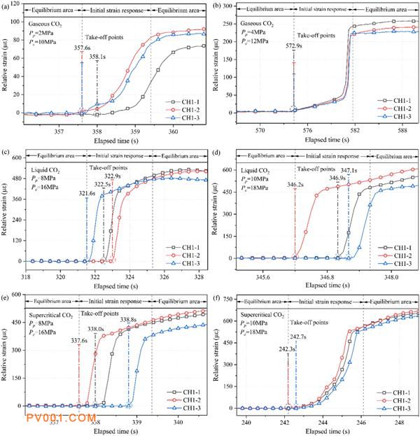 (a)~(b)气态CO2注入后光栅应变响应及时间差;(c)~(d)液态CO2注入后光栅应变响应及时间差;(e)~(f)超临界CO2注入后光栅应变响应及时间差。目前,国内外实验室已经对CO2室内岩芯驱替实验进行了深入研究,主要集中于CO2溶解捕获机理及运移过程的监测,但缺乏在封存条件下针对超临界二氧化碳(scCO2)实时运移过程中应力场变化及运移前缘的同步监测。中国科学院武汉岩土力学研究所首次利用光纤布拉格光栅(FBG)传感技术对不同状态CO2的驱替过程进行实时动态监测,揭示了在CO2注入压力诱导下的应力场变化机理以及运移前缘规律。