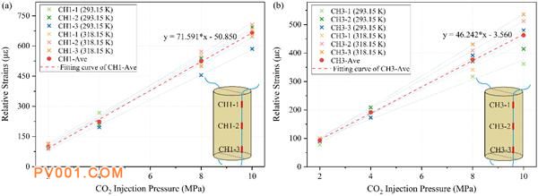 图1 表面粘贴两根FBG传感器(a)CH1和(b)CH3监测不同温度压力条件下CO2注入诱导岩芯表面相对应变响应