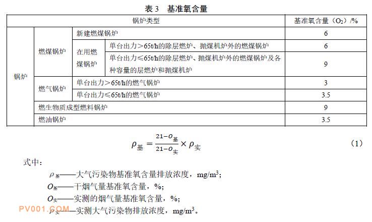 实测的锅炉颗粒物、二氧化硫和氮氧化物排放浓度,必须按公式(1)折算为基准氧含量排放浓度。锅炉的基准氧含量按表3的规定执行。