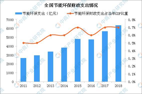 随着中国经济的持续快速发展,城市进程和工业化进程的不断增加,环境污染日益严重,国家对环保的重视程度也越来越高。绿水青山就是金山银山,国家出台了鼓励政策,同时加大了环保财政支出,2018年我国环保节能支持6353亿元,同比增长13%。值得注意的是,环保行业财政支出占GDP比重提升,2018年环保行业财政支出占当年GDP比重0.7%。