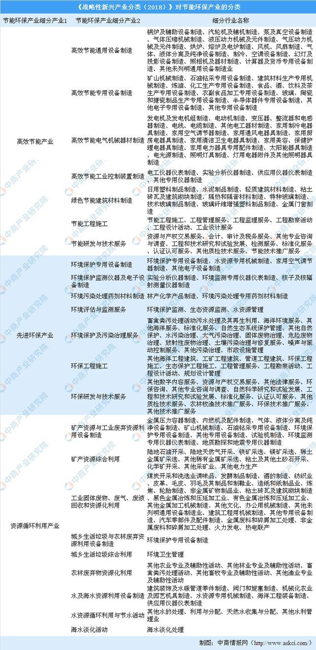 节能环保产业是指为节约能源资源、发展循环经济、保护环境提供技术基础和装备保障的产业,主要包括节能产业、资源循环利用产业和环保装备产业,涉及节能环保技术与装备、节能产品和服务等。《“十三五”节能环保产业发展规划》,提出发展节能环保产业,加强大气、水、土壤等污染防治工作。同时提出,到2020年,节能环保产业成为国民经济的一大支柱产业。在国家统计局2018年最新下发的《战略性新兴产业分类》对战略新兴产业的界定中,节能环保产业包含了高效节能、先进环保、资源循环利用三个细分产业,涉及23个细分行业。