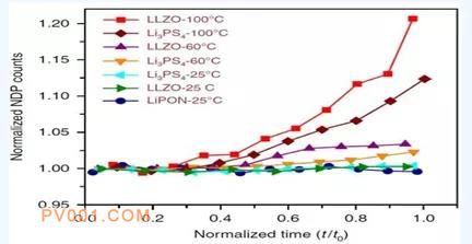 上图很明显可以看到,在整个锂沉积过程中,LiPON-25℃的体相区域中的锂含量保持恒定,LLZO和Li3PS4则在不同温度下均有枝晶生成,温度越高枝晶生长越多。