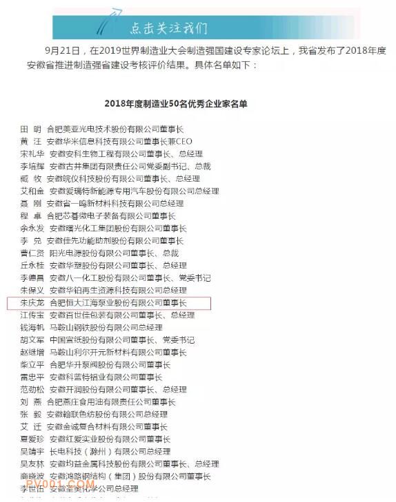 2019年9月21日,在2019世界制造业大会制造强国建设专家论坛上,我省发布了2018年度安徽省推进制造强省建设考核评价结果。合肥恒大江海泵业股份有限公司董事长朱庆龙先生等50名企业家,荣获“2018年安徽省制造业优秀企业家”称号!