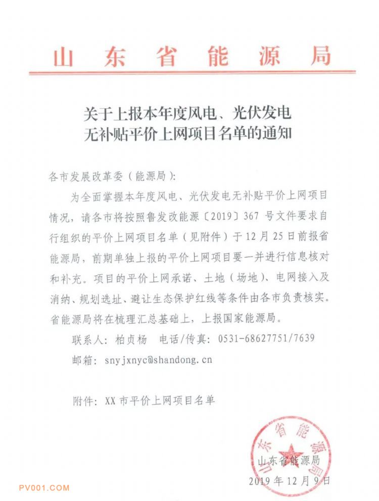 近日,山东省能源局发布关于上报本年度风电、光伏发电无补贴平价上网项目名单的通知: