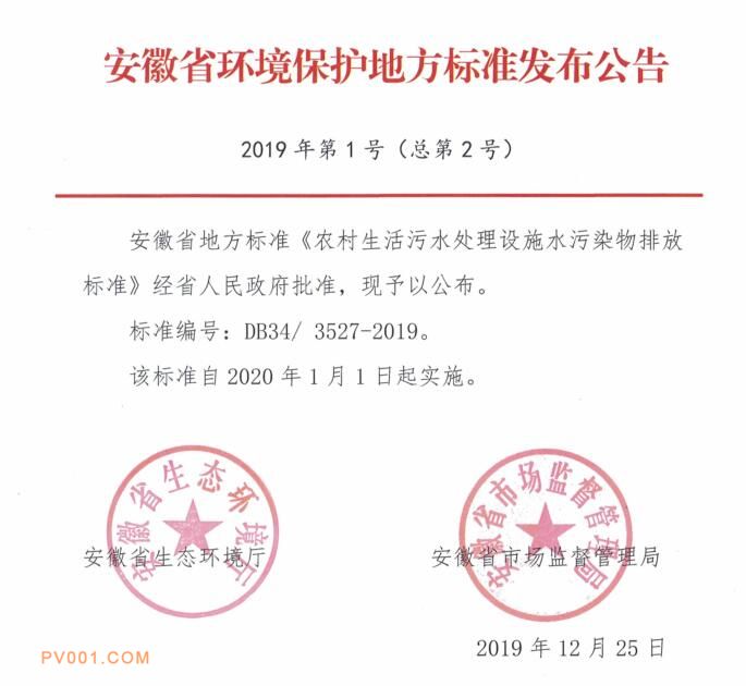 日前,安徽省发布安徽省地方标准《农村生活污水处理设施水污染物排放标准》,详情如下: