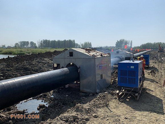 7月24日,青宁管道施工单位成功完成梨园大沟定向钻海缆与主管道同孔回拖,实现了中国石化首例高压大口径管道与光缆同孔穿越施工。(记者 | 彭强)