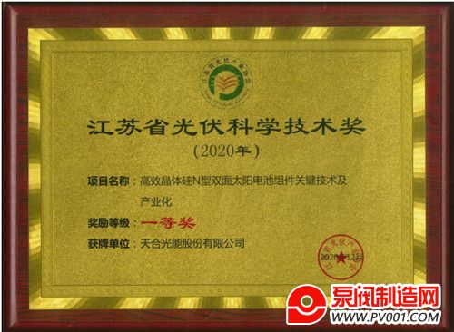 近日,由江苏省光伏产业协会主办的江苏省光伏产业协同发展大会在南京召开。大会现场颁发了2020年度江苏省光伏产业协会光伏科学技术奖。天合光能凭借“高效晶体硅N型双面太阳电池组件关键技术及产业化”项目荣获一等奖。