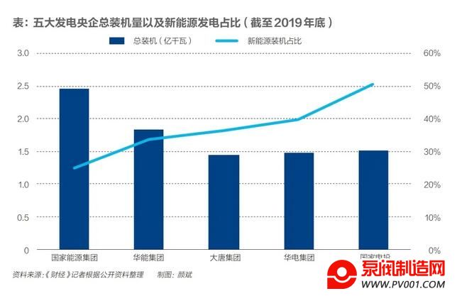 在五大发电集团里,可再生能源占比最高的国家电投集团的压力就比国家能源集团小得多,该集团的火电装机总量不到国家能源集团的一半,碳排放总量也不到后者的一半。截至2019年底,国家电投集团的可再生能源装机占比已超过50%。