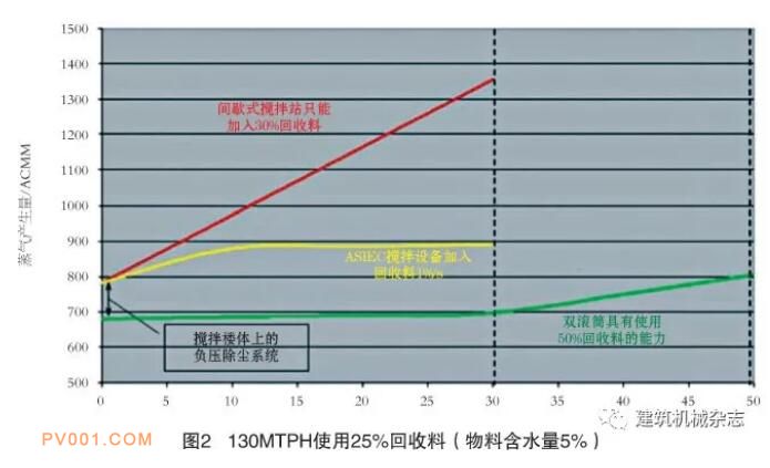 对使用回收料而又不增加设备负担的关键是尽可能连续不断地加入旧料。图2展示了3种不同形式加入旧料对除尘能力的要求。连续式双滚筒搅拌设备对除尘系统的能力要求最低,因为旧料是连续不断地加入的。除此之外,双滚筒具有使用50%旧料的能力,而间歇式搅拌站加入旧料的比例一般在30%左右。双滚筒是目前世界上唯一能够使用50%旧料而不需对旧料加热的沥青搅拌设备。当不使用旧料时,间歇式搅拌站和双滚筒搅拌站对除尘能力的需求区别在于搅拌塔上的负压除尘系统。