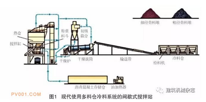原材料被分开和混合几次:在冷料仓被分开,在干燥滚筒被混合在一起,搅拌塔上的振动筛被再次分开(至少人们认为已被分开),在搅拌缸被再次混合在一起。这种原材料的处理过程是推动连续式搅拌设备发展的原因,但不是唯一的原因。