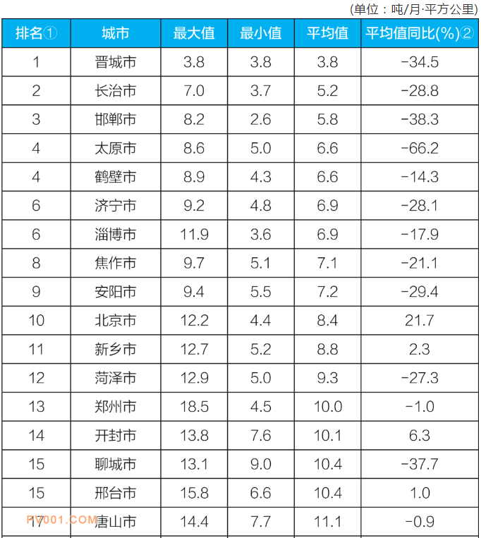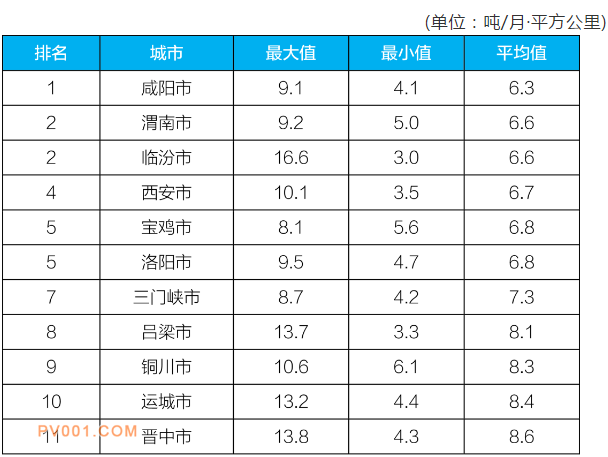 3月,汾渭平原11城市降尘量均值范围在6.3–8.6吨/月·平方公里之间,平均为7.3吨/月·平方公里。汾渭平原11个城市降尘量平均值均小于9.0吨/月·平方公里。临汾等9个城市降尘量最大值大于9.0吨/月·平方公里。汾渭平原11城市3月降尘监测结果详见附表2。