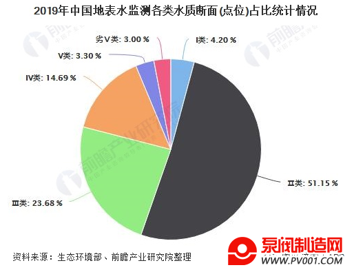 2019年,全国地表水监测的1931个水质断面(点位)中,Ⅰ~Ⅲ类水质断面(点位)占74.9%。2019年,长江、黄河、珠江、松花江、淮河、海河、辽河七大流域和浙闽片河流、西北诸河、西南诸河监测的1610个水质断面中,Ⅰ~Ⅲ类水质断面占79.1%,比2018年上升4.8个百分点;劣Ⅴ类占3.0%,比2018年下降3.9个百分点。主要污染指标为化学需氧量、高锰酸盐指数和氨氮。