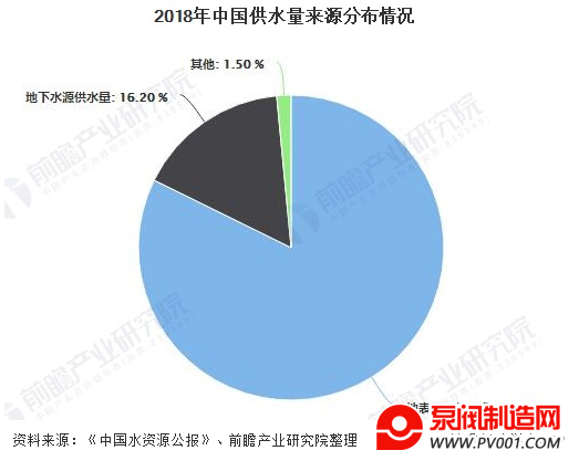 2018年地表水源供水量4952.7亿m3,占供水总量的82.3%;地下水源供水量976.4亿m3,占供水总量的16.2%;其他水源供水量86.4亿m3,占供水总量的1.5%。
