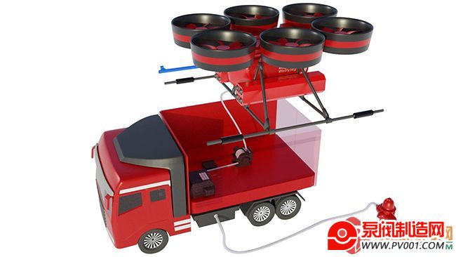 玮航科技目前的产品是系留涵道风扇垂直起降飞行器,通过和消防车体进行结合可形成系留涵道风扇举高消防车。该产品采用6涵道风扇的类多旋翼构型,设计最大起飞重量600公斤,挂载消防水炮,通过系留电缆和水带进行供电供水;设计额定悬停高度100米,水炮出水量50升/s。