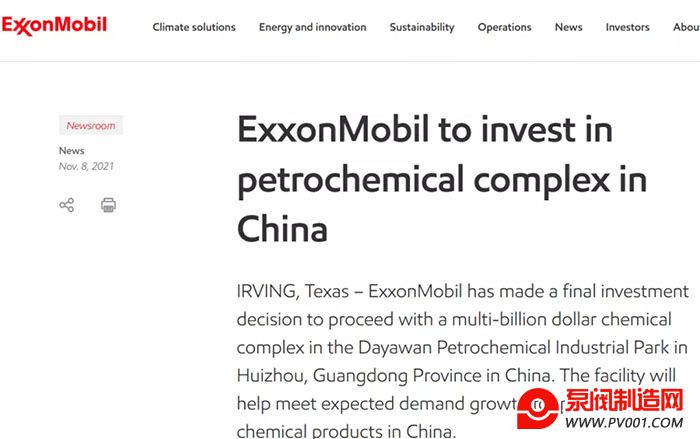 11月8日,埃克森美孚在官网发布消息,公司已作出最终投资决策,在中国广东惠州大亚湾石油化学工业区,全面推进投资数十亿美元的石化综合体项目。该设施将有助于满足中国市场对高性能化工产品的预期需求增长。