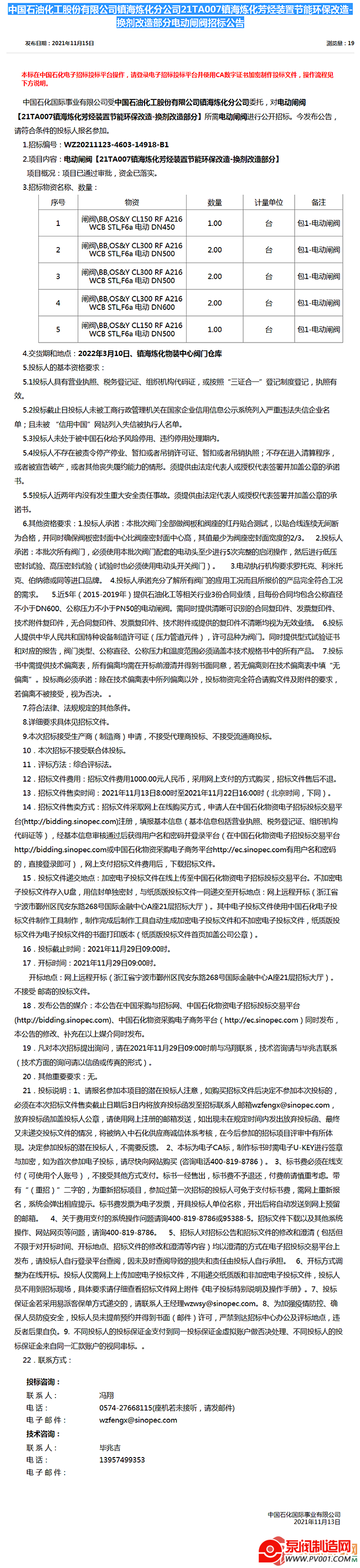 > 中石化21TA007镇海炼化芳烃装置节能环保改造-换剂改造部分电动闸阀招标公告