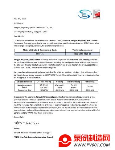 日前,从泛亚汽车技术中心传来好消息,江阴兴澄特种钢铁有限公司(以下简称”兴澄特钢”)紧固件用热轧和钢丝线材产品通过SGM/PATAC整车的材料认可,标志着兴澄特钢通过通用汽车全系线材认证。