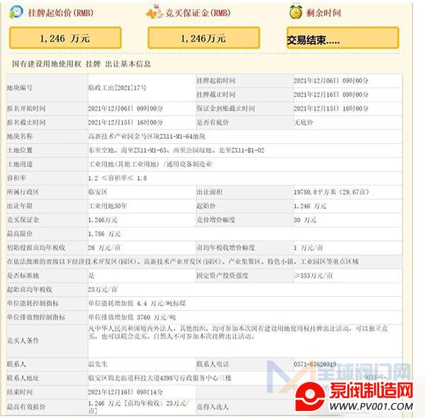 杭州市编号为临政工出[2021]17号地块,位于东至空地、南至ZX11-M1-65、西至公园绿地、北至ZX11-B1-02,工业用地,出让年限工业用地50年,出让总用地面积为19780.00㎡,建设用地面积19780.00㎡,容积率1.2≤容积率≤1.8,起始价1246.00万元,最终由浙江高中压阀门有限公司以底价1246.00万元(42.00万元/亩)成交。