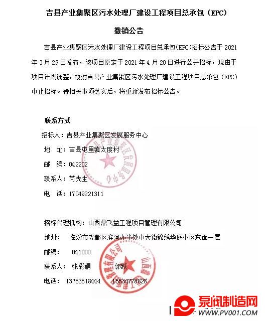 4月14日,全国公共资源交易平台发布了山西省吉县产业集聚区污水处理厂建设工程项目总承包(EPC)招标撤销(终止)公告,公告称,该项目原定于2021年4月20日进行公开招标,现由于项目计划调整,故对吉县产业集聚区污水处理厂建设工程项目总承包(EPC)中止招标。待相关事项落实后,将重新发布招标公告。
