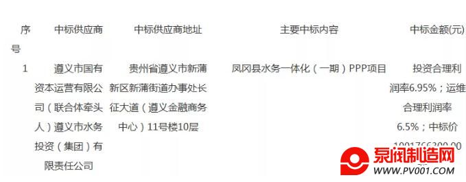 4月21日,中国政府采购网发布了贵州省遵义市凤冈县水务一体化(一期)PPP项目中标(成交)公告,中标供应商为遵义市国有资本运营有限公司(联合体牵头人)遵义市水务投资(集团)有限责任公司联合体,中标金额为投资合理利润率6.95%;运维合理利润率6.5%;中标价100176.63万元。