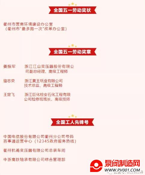 4月27日,2021年庆祝“五一”国际劳动节暨“建功‘十四五’ 、奋进新征程”主题劳动和技能竞赛动员大会在北京人民大会堂隆重举行。397个集体和1197名个人分获全国五一劳动奖状、奖章,1297个集体获全国工人先锋号。其中,衢州共有1个集体和3名个人分获全国五一劳动奖状和奖章,3个集体获全国工人先锋号。