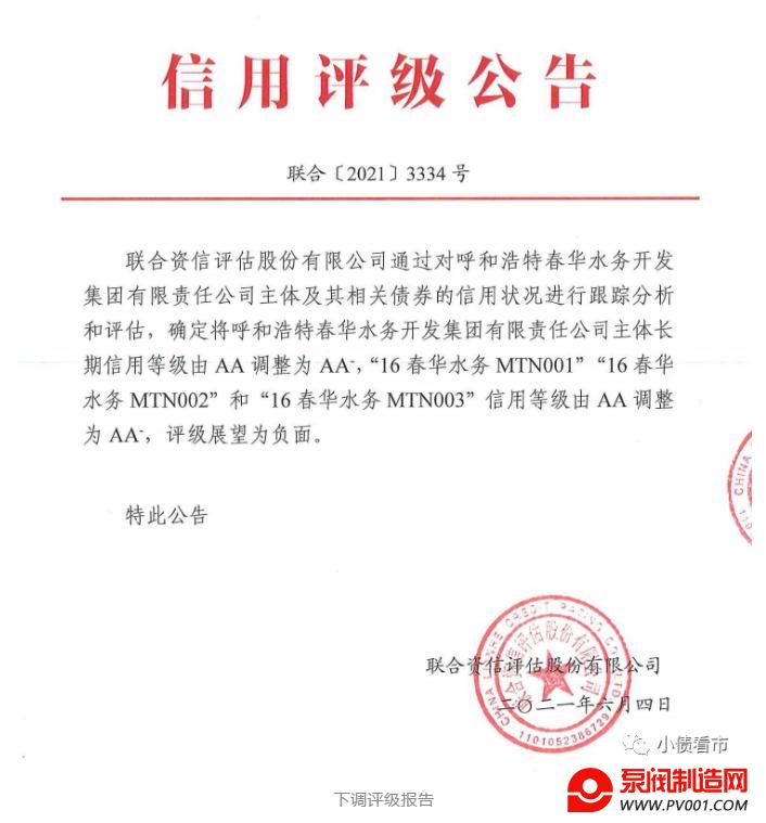 6月4日,联合资信公告称,将呼和浩特春华水务开发集团有限责任公司(以下简称“春华水务”)主体和相关债项信用等级由AA调整为AA-,评级展望为负面。