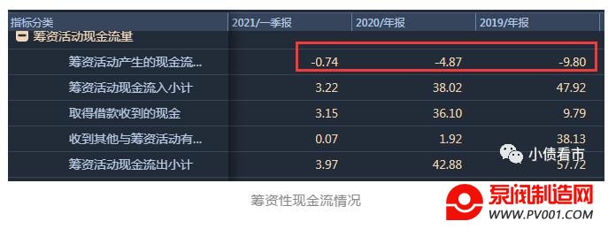 2020年和今年第一季度,春华水务筹资性现金流净额分别为-4.87亿和-0.74亿元。