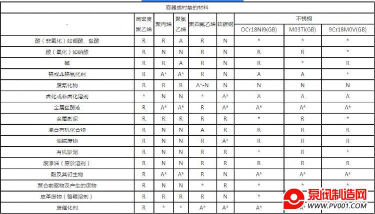 注:A:可接受;N:不建议使用;R:建议使用;*:因变异性质,请参阅个别化学品安全资料。