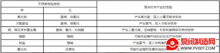 (7)盛装在容器内的同类危险废物可以堆叠存放,每个堆间应留有搬运通道;不得将不相容的废物混合或合并存放(部分不相容的危险废物可参考《危险废物贮存污染控制标准》(GB18597-2001)附录B表2)。
