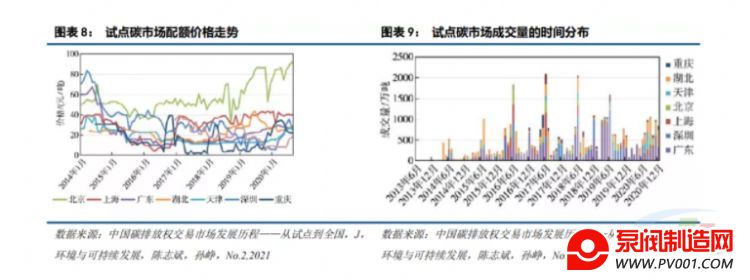 (2)配额分配:配额核定对于电力、热力、热电联产行业采用基准法,对于钢铁、化工、石化、石油开采行业采用历史法。无偿分配的配额一次性发放,有偿分配的配额通过拍卖或者固定价格出售尽在交易市场价格出现较大波动时稳定市场价格使用。结转规则说明未注销的配额可以结转至下年度继续使用。
