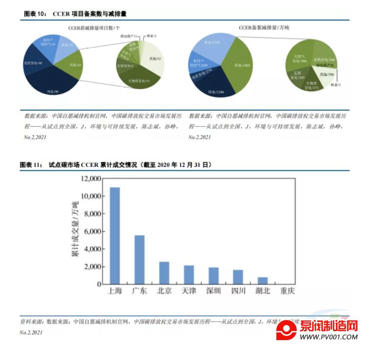 2012年国家发展改革委办公厅发布《温室气体自愿减排交易管理暂行办法》和《温室气体自愿减排项目审定与核证指南》,这两个文件基本确立了中国自愿减排项目的申报、审定、备案、核证、签发等工作流程,意味着国内自愿减排市场跨出了实质性的一步。此后,我国温室气体自愿减排交易体系不断完善,与此同时还推动了碳排放权交易试点工作的有效实施,为全国碳排放权交易市场在制度建设、技术储备和人才培养方面作了积极准备。中国核证自愿减排量(CCER,ChineseCertifiedEmissionReduction)的入市丰富了碳市场的交易品种,降低了重点排放单位的履约成本,提升了碳市场活跃度与运行效率,也为控排企业、投资机构等碳市场参与方提供了更广阔的空间。自愿减排项目于2015年1月正式启动交易,国家发展和改革委在2017年3月发布公告暂停CCER项目和减排量备案申请,目前尚有待生态环境部明确最终的自愿减排交易改革方案,重启CCER项目和减排量审批。截至CCER恢复备案前,国家发展和改革委公示CCER审定项目累计达到2856个,备案项目1047个,获得减排量备案项目287个。获得减排量备案的项目中挂网公示254个,合计备案减排量5283万吨二氧化碳当量(CO2e)。从项目类型看,风电、光伏、农村户用沼气、水电等项目较多。
