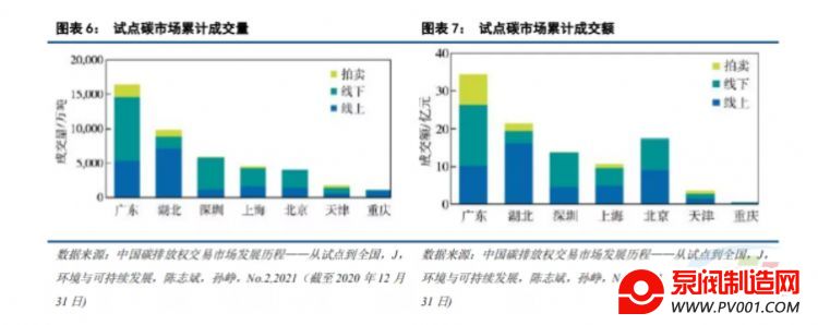 2013年以来,我国建立七个碳交易试点市场。其中,北京、上海、湖北、广东和深圳碳市场表现较好,天津和重庆碳市场表现较差。截至2020年12月31日,我国各试点碳市场配额现货交易累计成交4.45亿吨二氧化碳当量(CO2e),成交额104.31亿元。广东、湖北、深圳累计成交量位列前三位,广东、湖北、北京累计成交额位列前三位。