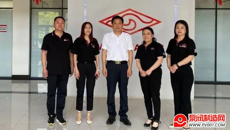 宋银立秘书长(中间)与迈克阀门总经理赵桂芝(右二)生产副总刘红伟(左二)行政副总黄红梅(右一)玛钢产品及工艺优化科负责人李云虎(左一)合影留念