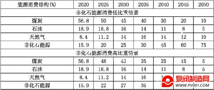 在具体实践中,非化石能源消费比重可能努力突破所设定的目标,比如《能源发展“十三五”规划》提出到2020年非化石能源消费比重提高到15%以上,而2019年非化石能源消费比重为15.3%,提前一年就完成了规划设定的目标,2020年非化石能源消费比重接近16%,比预定目标提高近1个百分点。据此,本文设定高比重情景下,2025年和2030年的非化石能源消费比重分别为22%和27%。对于2035年和2050年的非化石能源消费比重,分别设定为30%-35%和75%-80%,2035年之后非化石能源消费比重每五年提高15个百分点。