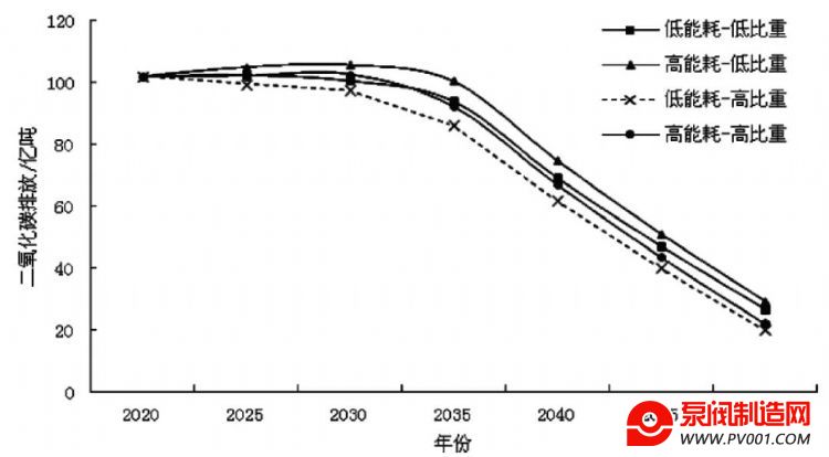 能源消费总量和结构的两种情景设定结合,组成了四种未来能源转型和碳减排情景:一是低能耗—低比重情景;二是高能耗—低比重情景;三是高能耗-高比重情景;四是低能耗—高比重情景。二氧化碳减排速度最快的是低能耗—高比重情景,其次是高能耗-高比重情景,再次是低能耗—低比重情景,最后是高能耗- 低比重情景。低能耗—高比重情景下,二氧化碳排放量有望在“十四五”期间达峰,其余三种情景下碳达峰将在“十五五”期间实现。如图2所示,四种情景下能源转型和碳减排都将在2035年之后显著加速。2030年能源消费二氧化碳排放量为97-105 亿吨,到2035年下降至86-100亿吨左右,到2050年降至20-29亿吨,2050年可以实现能源消费二氧化碳的深度减排,有望在2060年就实现近零碳排放能源体系。上述四种情景均能够满足2030年前碳达峰和2060年前碳中和的要求。